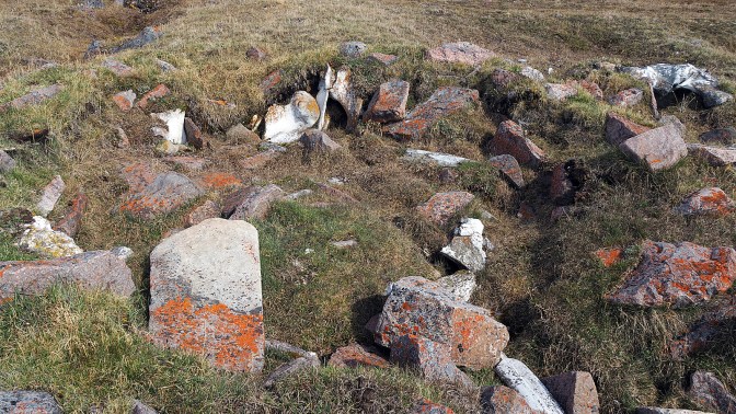 We are camped among some old winter houses made of boulders and whale bone dating back anywhere from 500 to 1000 years, perhaps even older, predating the arrival of modern Inuit. Large chunks of whale bone stick up from the ground, forming circular pits lined with boulders. In their time, the whale bones would have formed a trellis above the pit and animal skins would have covered the structure. It’s unimaginable that people with only primitive tools successfully hunted whales here. It’s a cool site but I’m too tired to really appreciate it and go to sleep.