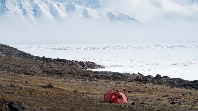 After a while, we continue and follow the bear’s tracks. He’s a big boy with size 12 feet. His track eventually makes a sharp turn to the right out to the open sea ice and we continue to pick our way through the ice rubble near shore. We have a good day and manage 22 kilometres. We’re only a day away from Grise Fiord now. We are camped in the shade of the mountains, and while the sun shines on the ice out to sea and Devon Island beyond, a cold wind drives us back into the tent where we make dinner. It’s amazing what comfort a few microns of nylon can provide.