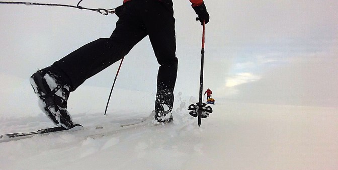 The blizzard continued dumping 15 cm of new snow. We linger over breakfast and coffee, delaying our departure, but we eventually decide to give it a try. We grope our way further up the glacier but it’s too difficult dragging the sleds. One of us dumps his sled and breaks trail while the other follows. Then we switch while the other returns to get his sled. We do this until we reach the height of land at about 800 metres (2,500 ft). The visibility improves and we point our skis downhill.