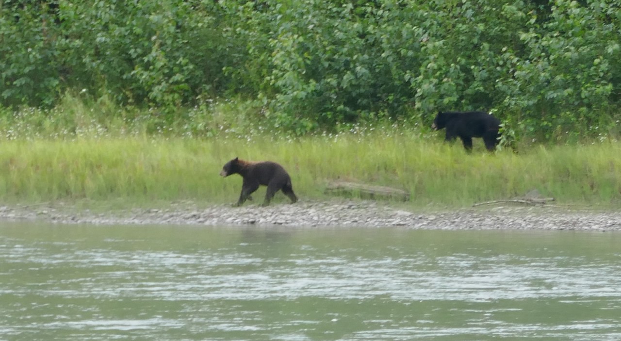 The moose are still there in the morning and we watch them tentatively get into the river at the southern tip of the island while we prepare breakfast and pack up our camp. Another movement on the island draws our attention away from the moose. Two black bears are wandering down the shore toward the moose. They are large bears but could still be with a sow, although, we never see one.