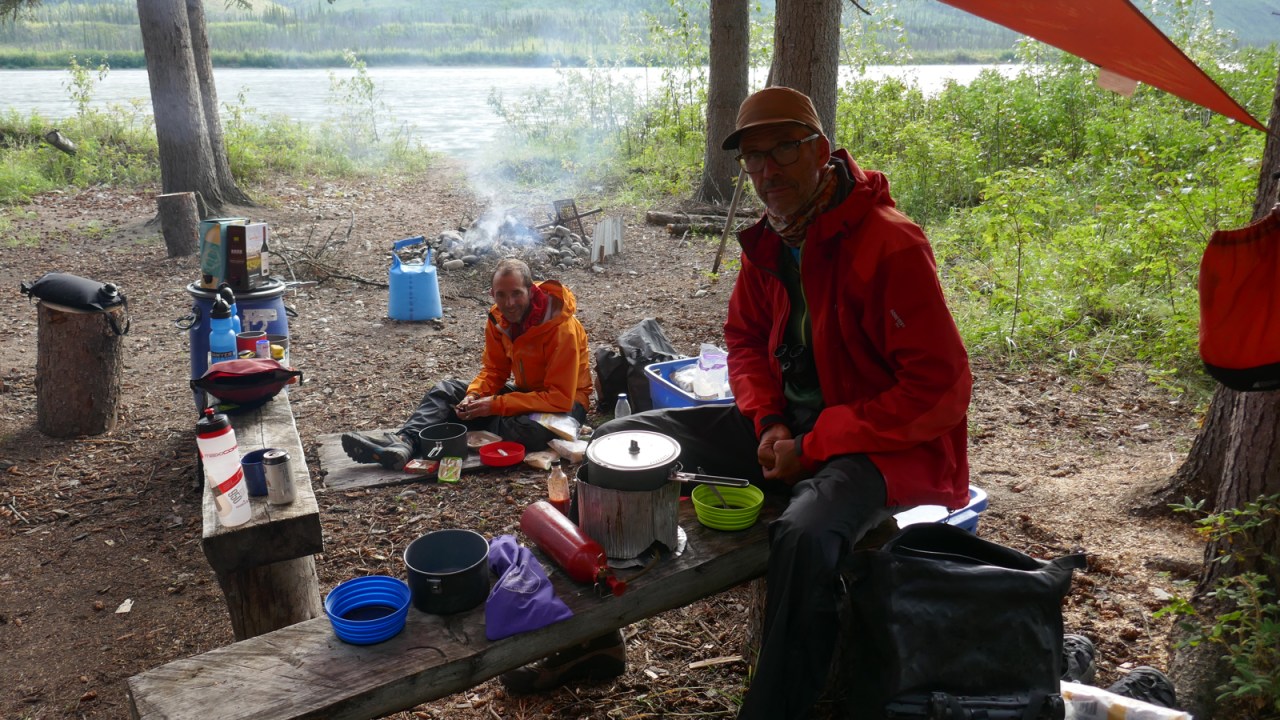 We’ve been preparing Alba and Gérard for a few days for the one and only rapid on the Yukon River we have to run: Five Finger Rapids. It’s an easy class II but looks intimidating as the river squeezed through a narrow opening between rock pillars. We’ve practised drawing and prying strokes, eddy turns and bracing the canoe. They’re ready.