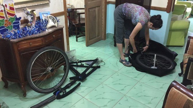 We walk back to where we stayed at the start of our trip to collect our luggage, and with Rodney’s help we flag down a bicycle taxi – a tricycle with a double back seat – to take us back to Centro, as the bike bags are too difficult to carry that distance on foot. For CUC$3, the guy pedals us through the busy traffic of Havana’s Barrio China back to our digs in Centro where we disassemble and pack up one of the bikes, leaving the other for the next day.