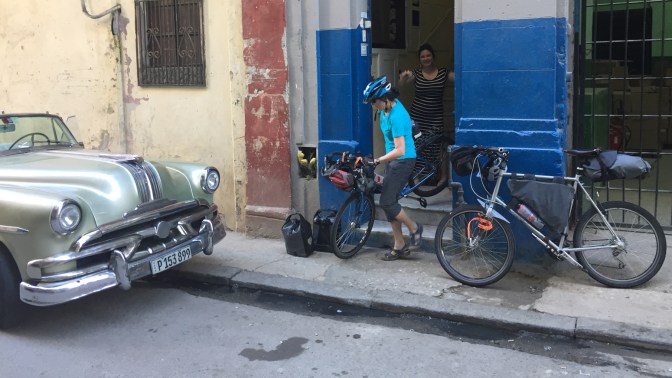 After changing our Canuck dollars into CUCs, Cuba’s convertible peso for tourists, he squeezes our two small suitcases and two bicycle bags into the car and drives us from the airport to our Casa Particular in Old Havana where we are warmly welcomed by our hosts Rodney and Laura.