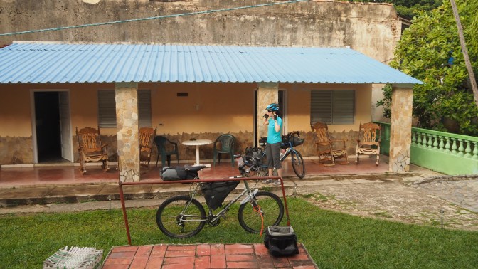 It’s not going to be 5-star, or even 3-star, but all the places we stayed in were clean, some had hot water – others claimed to have hot water but it was more lukewarm or cold – and the food was tasty and often more than we could eat (and I can eat a lot). Although a little monotonous – chicken or pork or fish with rice and beans, platano and salad – everything was fresh. Security for our bicycles was always taken seriously by the hosts, offering to lock our bikes in the house or allowing us to take them into our room.