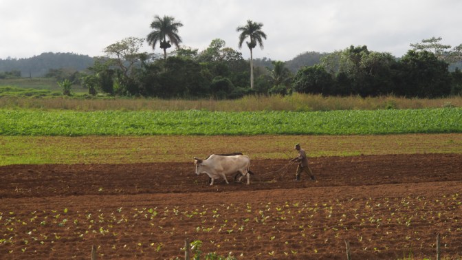 The landscape around Viñales is gorgeous. A wide, fertile valley is bounded on both sides by limestone mogotes, rounded hills with steep sides. The fields are being worked with ox teams as most farm machinery has all but disappeared following the cessation of Soviet aid after the collapse of the Soviet Union in 1991. Agriculture in Cuba reverted back to basics, resulting in largely organic production.