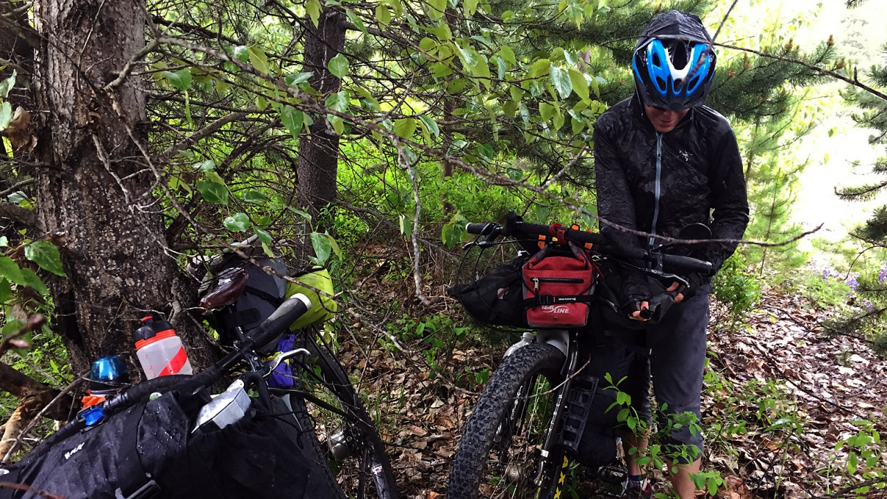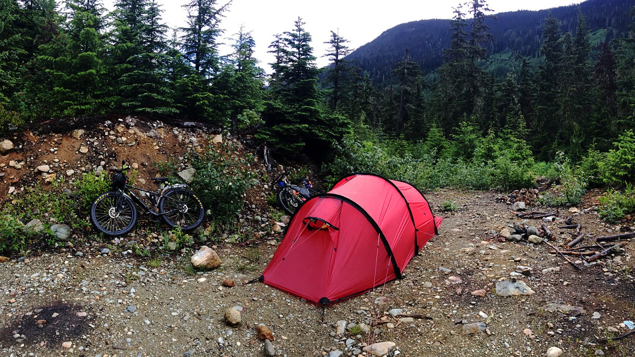 The Hurley is steep and rough. For 15 kilometres, the road angles up almost without mercy. Because of our late start, we didn’t get that far, only eight kilometres, when the weather forced us to stop. With dark clouds racing in, we came upon an old side road with enough flat ground to pitch the tent. We got it up just as the downpour began.