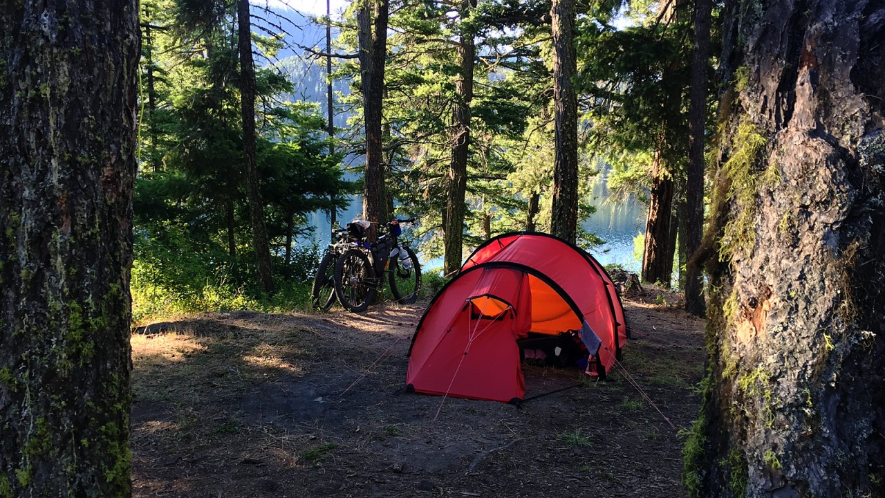 After a snack, we ride four kilometres further along the lake and take the Tyaughton Lake Road up to Mowson Pond. It’s a steep two-kilometre climb but the reward is a gorgeous lake-side camp site with sweeping views of the surrounding mountains.