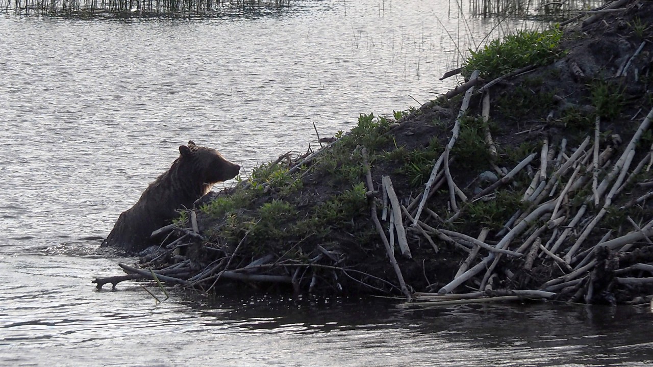 The bear is in the lake and slowly wading out from shore across a small bay to a beaver lodge where not half an hour earlier we had been standing. It suddenly dives under water and I wonder if the beaver is defending its lodge. He comes back up right away and starts to climb out onto the mound.