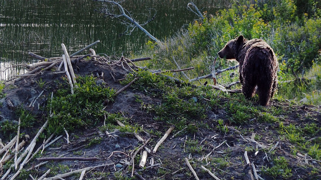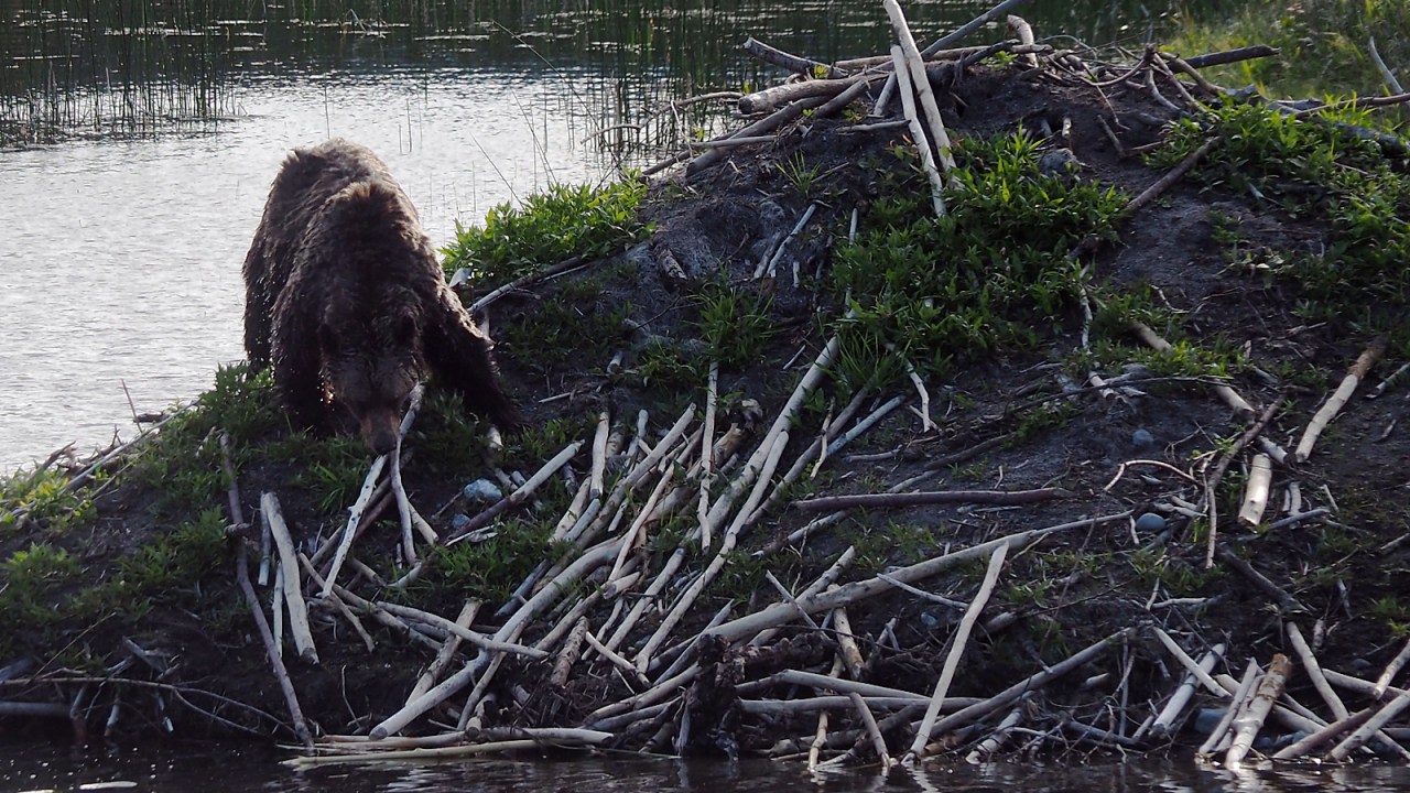 We’re all a bit more relaxed now that the immediate threat is over and we watch this beautiful apex predator sniff around the mound of the beaver lodge. The sun is low in the sky behind it and we can see the water droplets falling off its fur like so many shimmering diamonds. What a gorgeous animal.