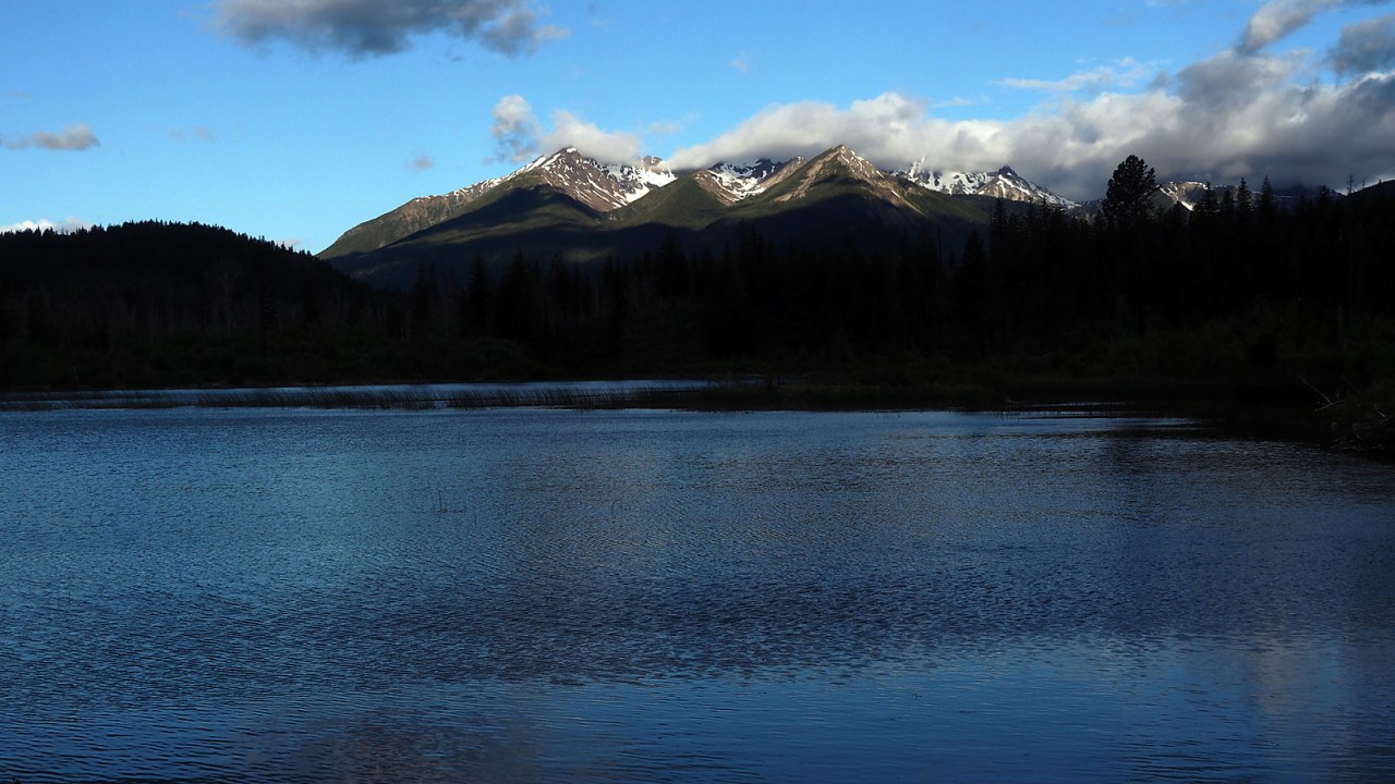 We break camp, pack the bikes and head back out to the road. At the north end of the lake, we take the Slim Creek Mainline Road. It’s a gently meandering road through the forest with occasional views of the mountains on the south side of Carpenter Lake. We make a short detour to Plateau Ponds, reflecting the mountains to the west in the clear water.