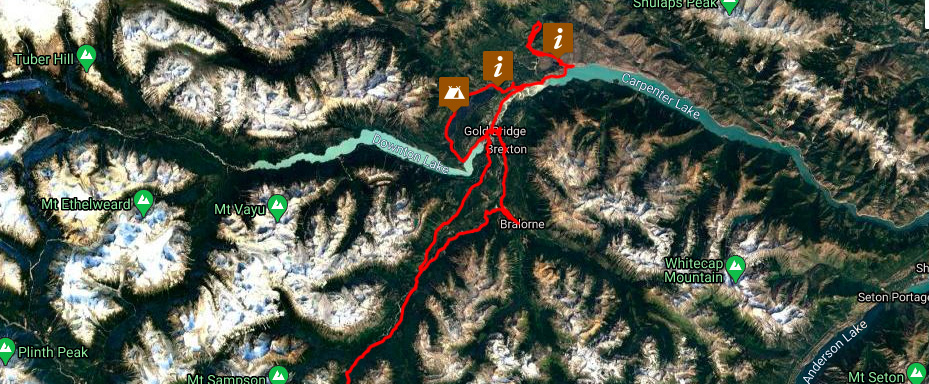 We ride back along Carpenter Lake to the town of Gold Bridge. It’s quiet with nobody around. We try to get some information about the condition of the East Hurley Road south of Bralorne but the proprietor of the hotel has no current update about a wash-out. We go anyway.