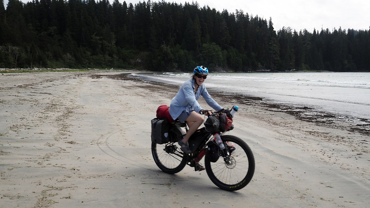 We ride the length of Pachena beach as the surf crashes on shore and the wind blows us along the hard sand exposed by an ebbing tide. We love it. It would be so nice to camp here but, alas, we can not, and ride the last six kilometres into Bamfield.