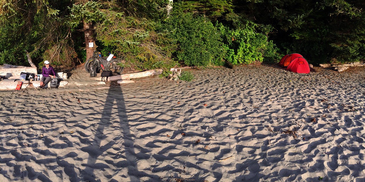 We get a water taxi ride across the inlet to the west side of town so we can go to Brady’s Beach to camp, as suggested by a motorist who stopped to talk to us the previous day at the Nitinat River bridge. It’s quiet in Bamfield and Brady’s Beach is nearly deserted. I call my mom to wish her a happy birthday and tell her about our first few days on the road.