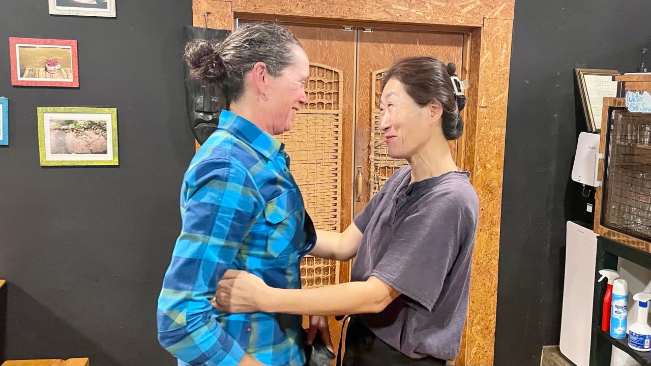 We dropped our stuff in the hotel and rushed back to Papaya Hamburger. She was just closing up but urged us inside. She said she would stay open late for us. We were the only customers at the end of the day and she made us delicious horse meat burgers with a big helping of fries. A five-star meal for two hungry cyclists.