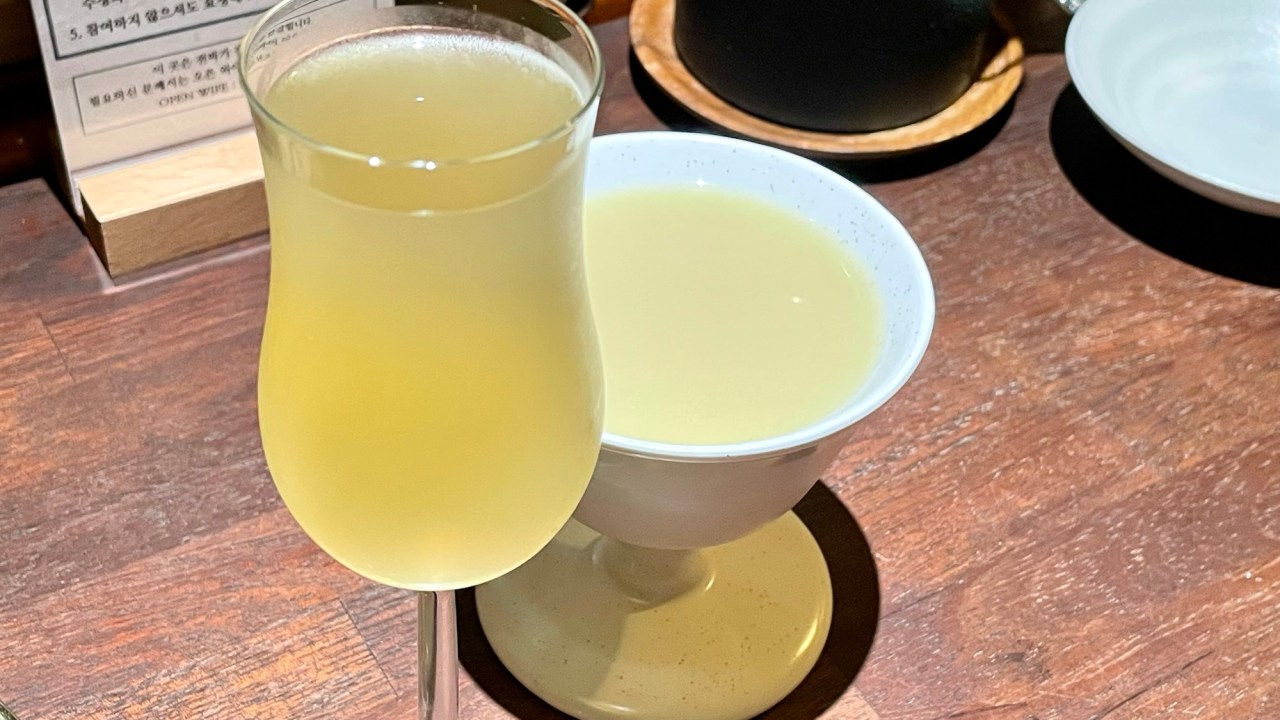 One was Goheung Yuja, a Cheong-ju or a clear rice wine, and the other was mandarin makgeolli, an ivory rice wine. It’s an unpasteurized rice wine that continues to ferment in the bottle and therefore has a short shelf life.