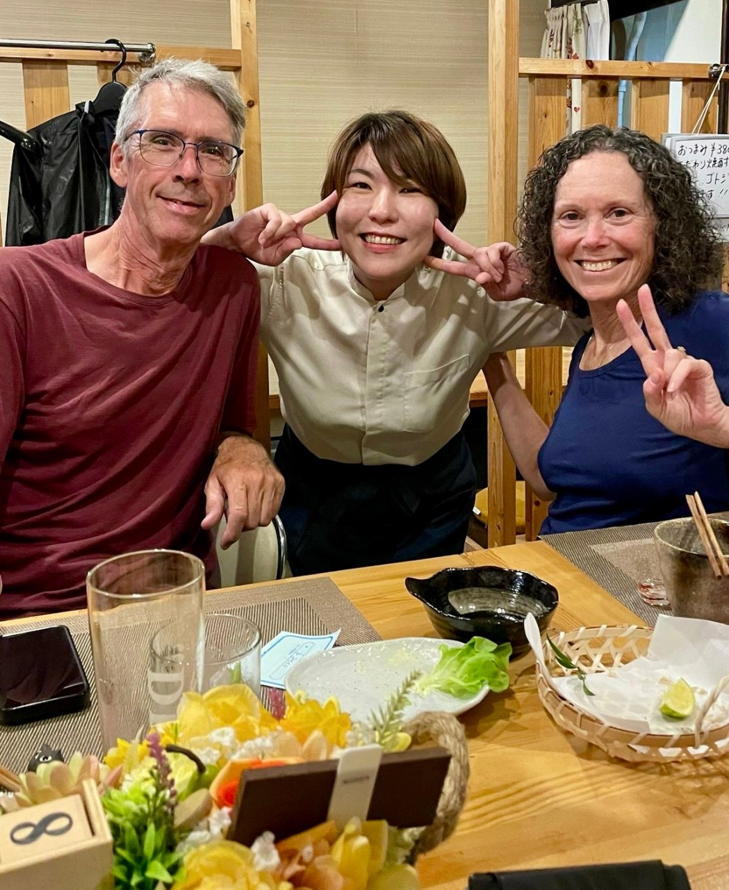 We enjoyed the onsen at our ryokan — there are 2,000 of them in Beppu. It was glorious to sit in the hot water after our cold wet end of the ride. We went out for a nice dinner nearby afterwards and slept like babies.