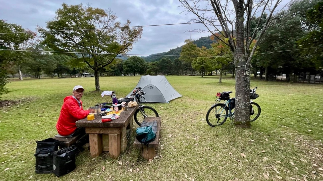 We had another lengthy ride of 90 kilometres ending in Higashikushira and its municipal campsite. Many towns maintain these campsites and they are free to use. They always have bathrooms stocked with toilet paper and soap, and often cooking shelters, complete with barbecues and sinks to wash up dishes.