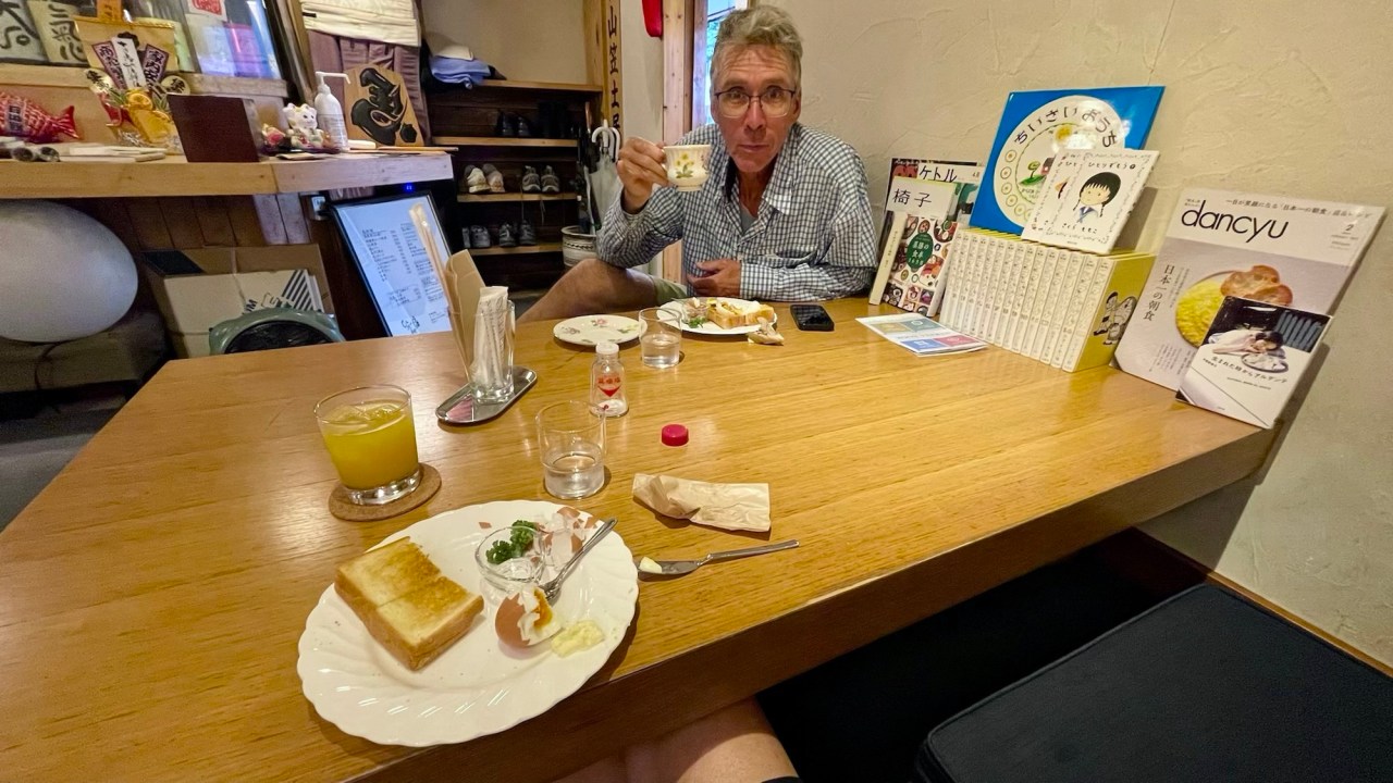 We arrived in Fukuoka on Kyushu Island early the next morning and once we were through immigration, we set off in search of a place for breakfast. We found a little coffee shop where they served toast and eggs and good coffee, Japanese-style, shoes off at the door and sitting on tatami mats at a low table.