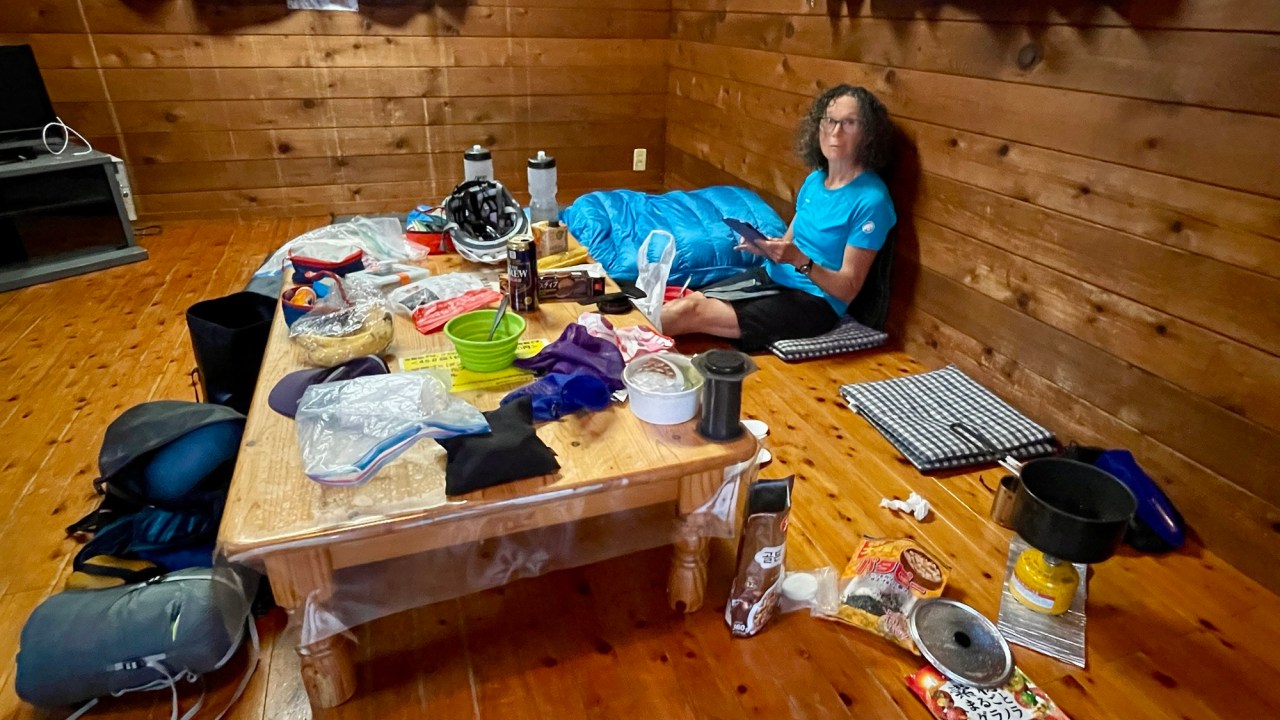 It was a bit pricey at ¥3,850 but they also had little rustic cabins for ¥4,950. It was a no-brainer to go for a cabin. There was nothing in it except a low table and some cushions but it was just what we needed at the end of that day, arriving at dark and tired from successive long days of riding. We were due for a day off.