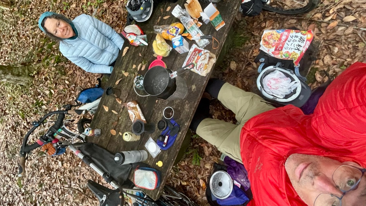 We finish the day on the outskirts of Shikokuchuo heading for a campsite but as we ride towards the entrance a gardener stops us and tells us it’s closed for the season. We turn around and since the sun is nearly down we have few options. There is a small park just adjacent to the campsite. It has functioning toilets and a gazebo with a table. Good enough and we call it home for the night.