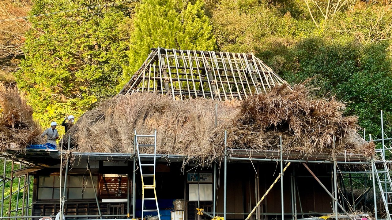 Nearby there are also some traditional houses with thatched roofs. Workers are busy replacing one of the roofs. The structure of the roof is made of bamboo poles lashed together and then covered with a thick layer of thatch.