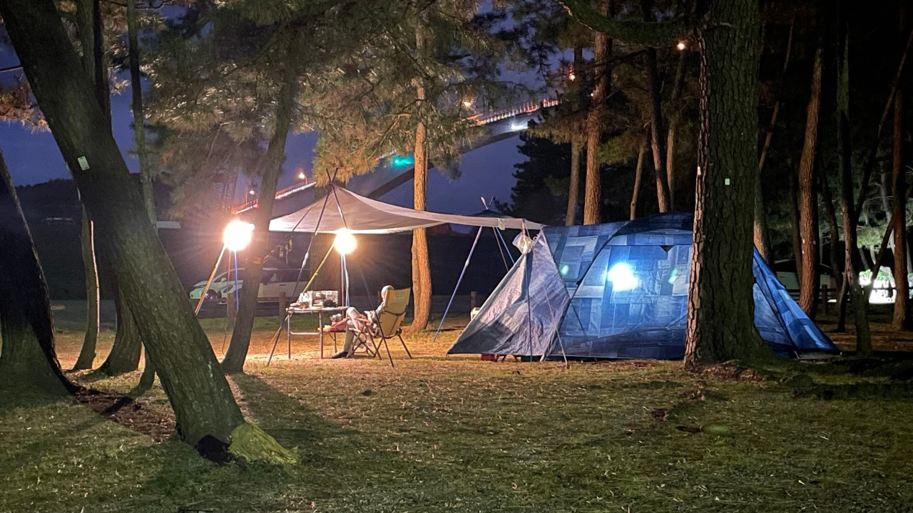 By late afternoon, on the outskirts of Imabari, we ride down into a beachside campsite that’s nearly deserted. There are two tents pitched on the windy field near the bathrooms and we ride around to find a spot that’s out of the cold wind coming off the water.