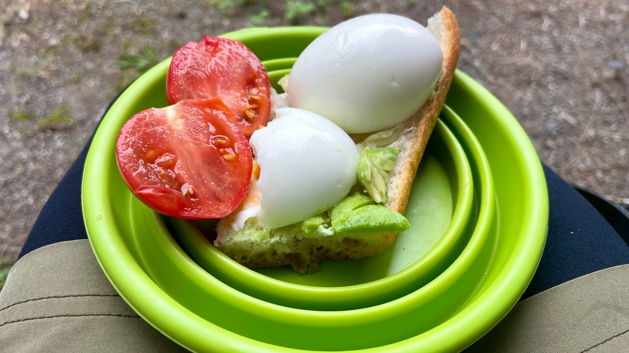 The rain starts while we’re breaking camp. We sit under cover on the edge of the toilet block making our breakfast of boiled eggs, with tomatoes, avocado and a baguette. Good bread has been hard to find so we haven’t eaten much of it. When we do find it we will happily buy it for a change from noodles and rice. Our other breakfast staple, granola, is easy to find in most supermarkets. It’s our go-to breakfast with yoghurt and some fruit.