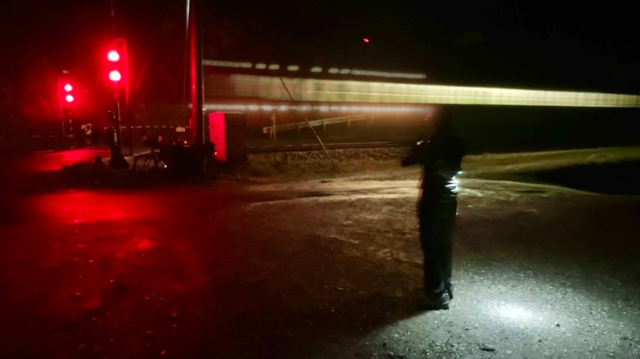 We stand and wait in the pitch dark by a railway crossing. The bells sound and the lights flash as a train approaches and passes by. At least the rain has stopped but we’re soaking wet from riding in it all day.