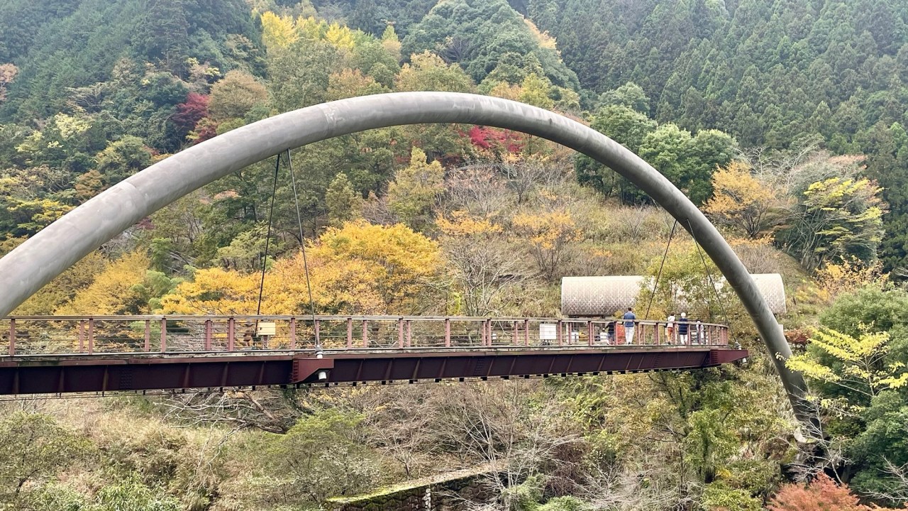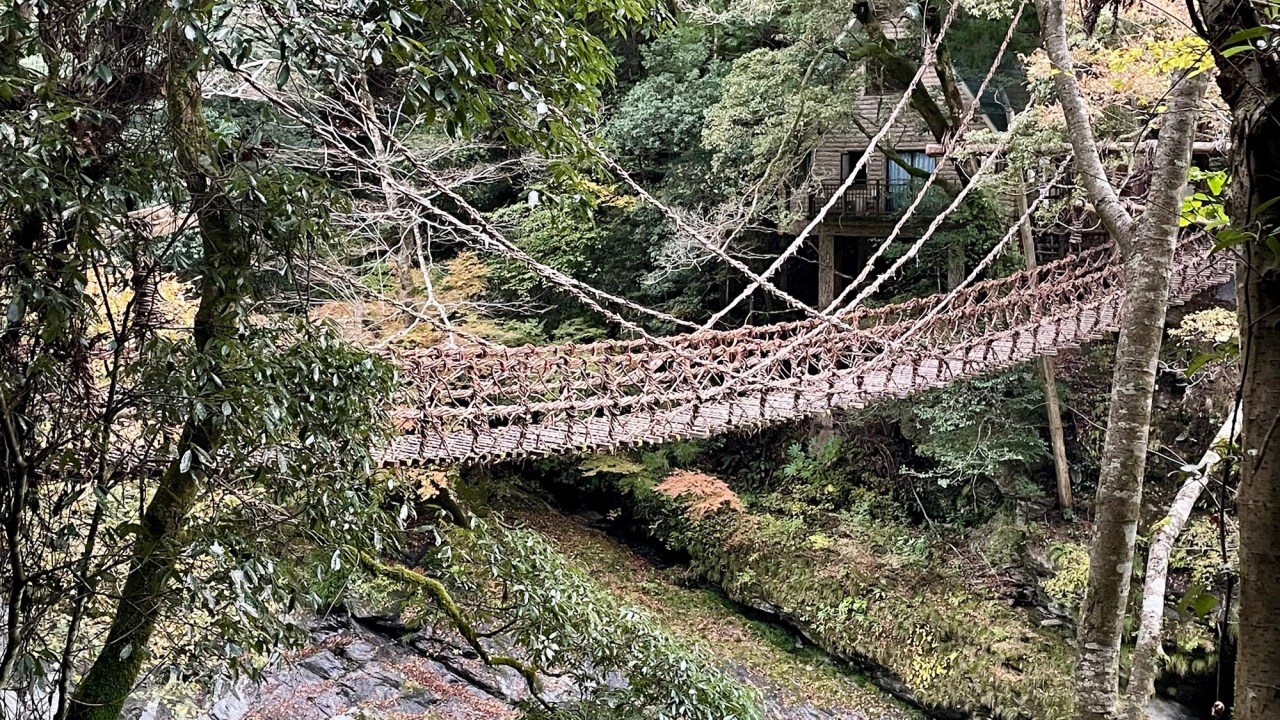 We’re in the Iya Valley at a campsite near the vine bridge, a popular attraction. It’s a traditional kazurabashi pedestrian bridge made of wood and rope-like vines (kazurabashi) from a local kiwi plant, although steel cables have been used to fortify the structure. There were 13 of these bridges but only three still exist.