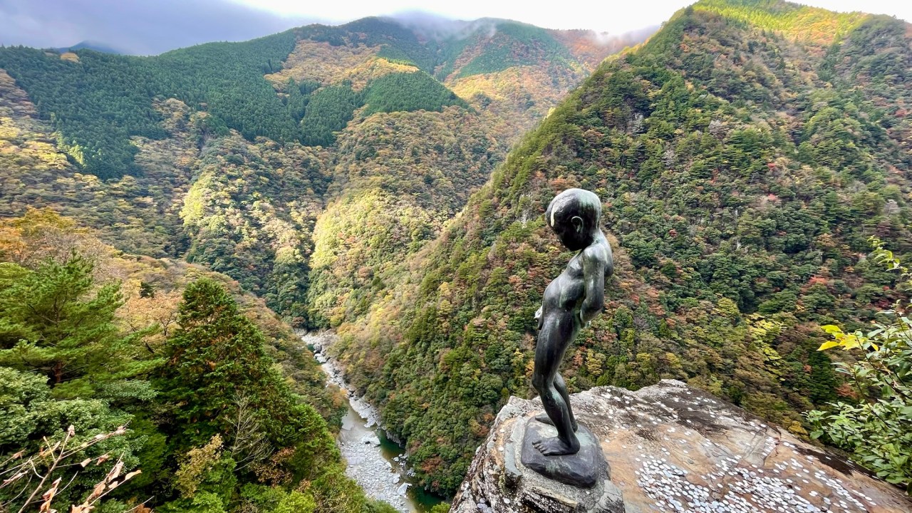 And just a bit further down the road is the peeing boy statue standing on a cliff edge beside the road. In the old days, it’s said the local children would stand on this cliff and urinate into the ravine to show their bravado. I briefly have the urge to climb up there beside the statue and relieve myself but the sheer drop overrules the mischievous boy in me.