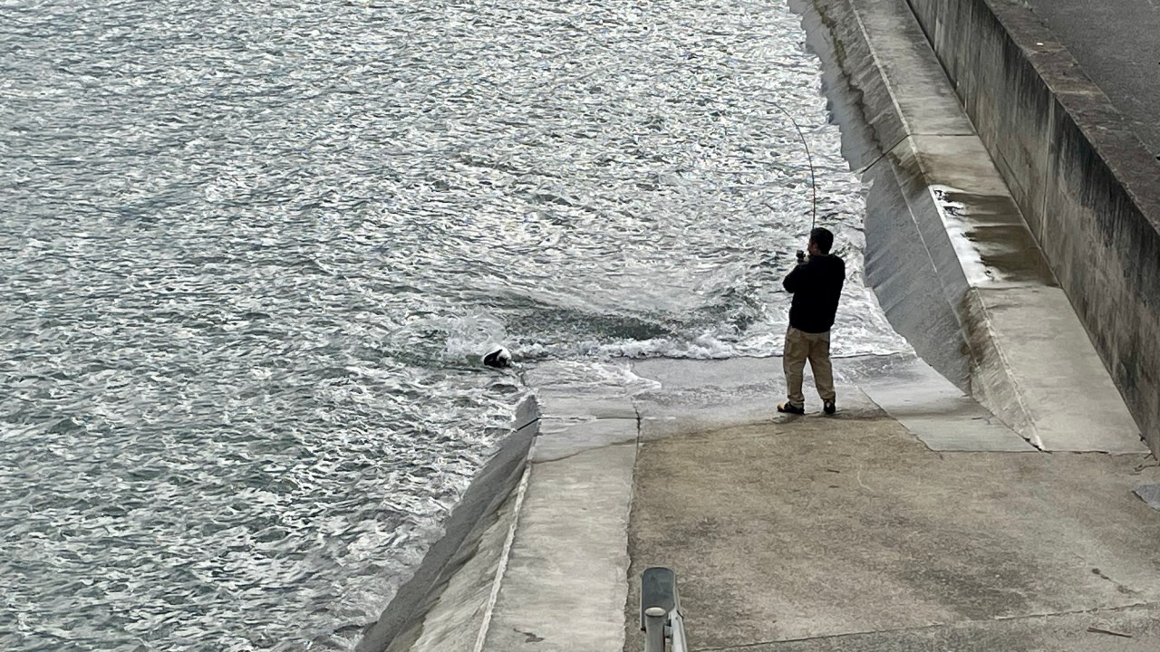 We stop on a bridge to watch a guy trying to land a big fish that’s giving him a fight. It turns out to be a ray, at least two feet wide.