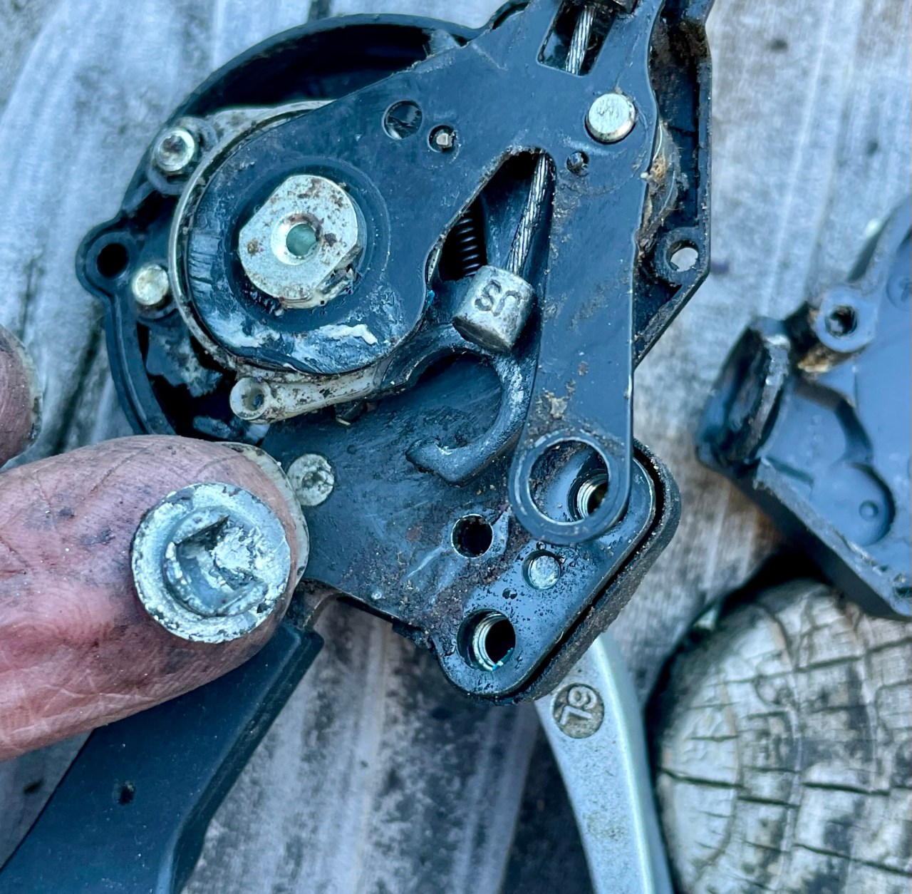 In the morning I discover my front shifter is not functioning. There is no tension on the levers. I remove it and open it up, confirming what I already knew. It’s busted beyond repair.
