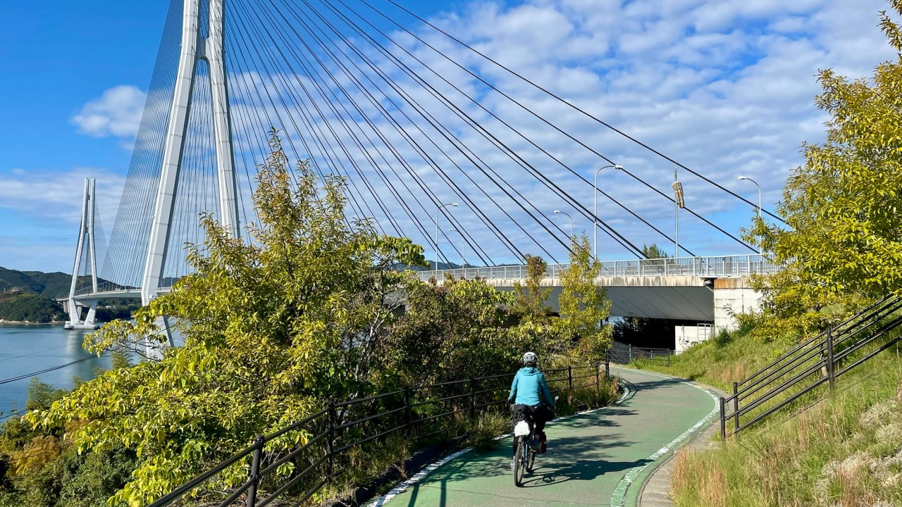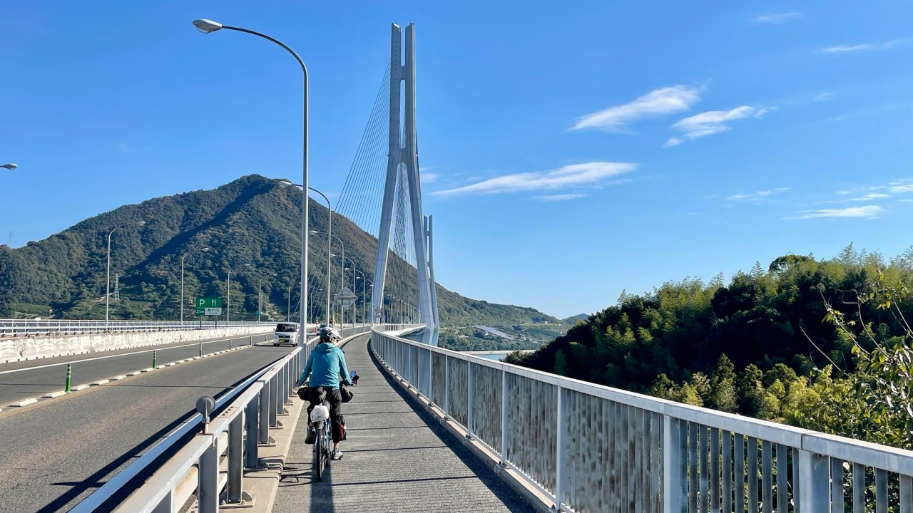 It’s impressive to ride onto the Kurushima Kaikyo bridge on a long spiralling ramp that climbs up to the bridge deck. Once up there, the three connected bridges stretch ahead of you for about five kilometres, undulating as they go.